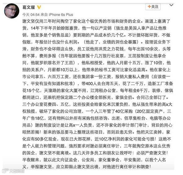 这成为了上海家化宫斗剧第二季的导火索。前董事长葛文耀用微博长文炮轰管理层,直接将这家百年老店内部的“宫斗剧”曝光于众。葛文耀呼吁严查刚辞去董事长职务的谢文坚,称谢文坚“用洪荒之力花钱”,仅用三年时间掏空了上海家化这个具有极优秀的市场和财务的企业,并称将向证监会、公安局、家化董事会、平安集团举报谢文坚。