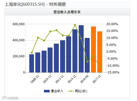 公开财报数据显示,2015年上海家化营业收入58.5亿元;2015年净利润虽然翻倍增长,但主要是变卖天江药业资产所得,扣除非经常性损益的净利润仅为8亿元。