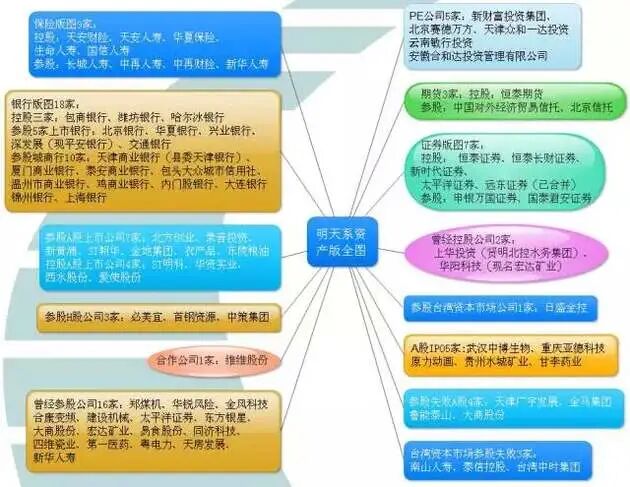 不过目前可以统计出来明天系曾经染指的公司有近百家之多,但真正值钱的是明天系拥有的金融资产。目前明天系仍然控股着天安财险(交易中)、天安人寿、华夏保险、生命人寿、国信人寿;参股了长城人寿、中再人寿、中再财险、新华人寿等保险公司。