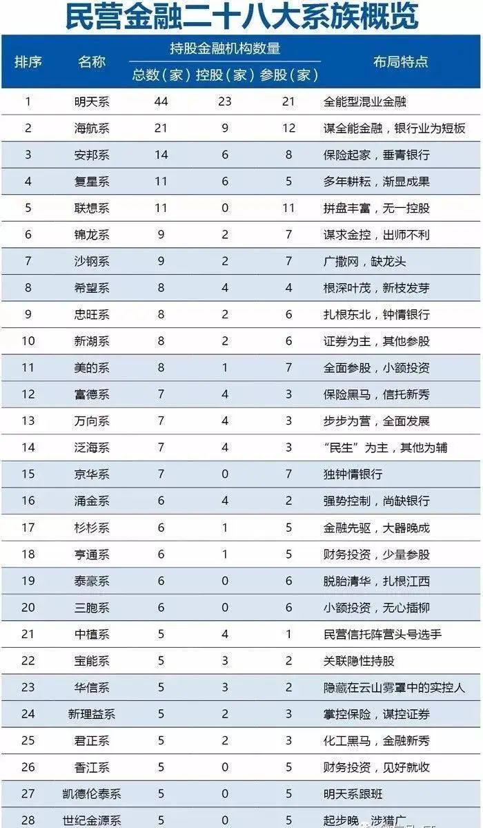 银行资产明天系更是毫不含糊,控股了包商银行、潍坊银行、哈尔滨银行等城商行;并参股天津商业银行(现为天津银行)、厦门市商业银行(现为厦门银行)、泰安商业银行、包头大众城市信用社、温州市商业银行、宝鸡商业银行、内蒙古银行、大连银行、锦州银行等城商行。其中天津银行、锦州银行已在港股上市,包商银行、哈尔滨银行、大连银行等正在A股或者港股IPO,一旦上市,明天系的市值规模还要再大幅增加。
