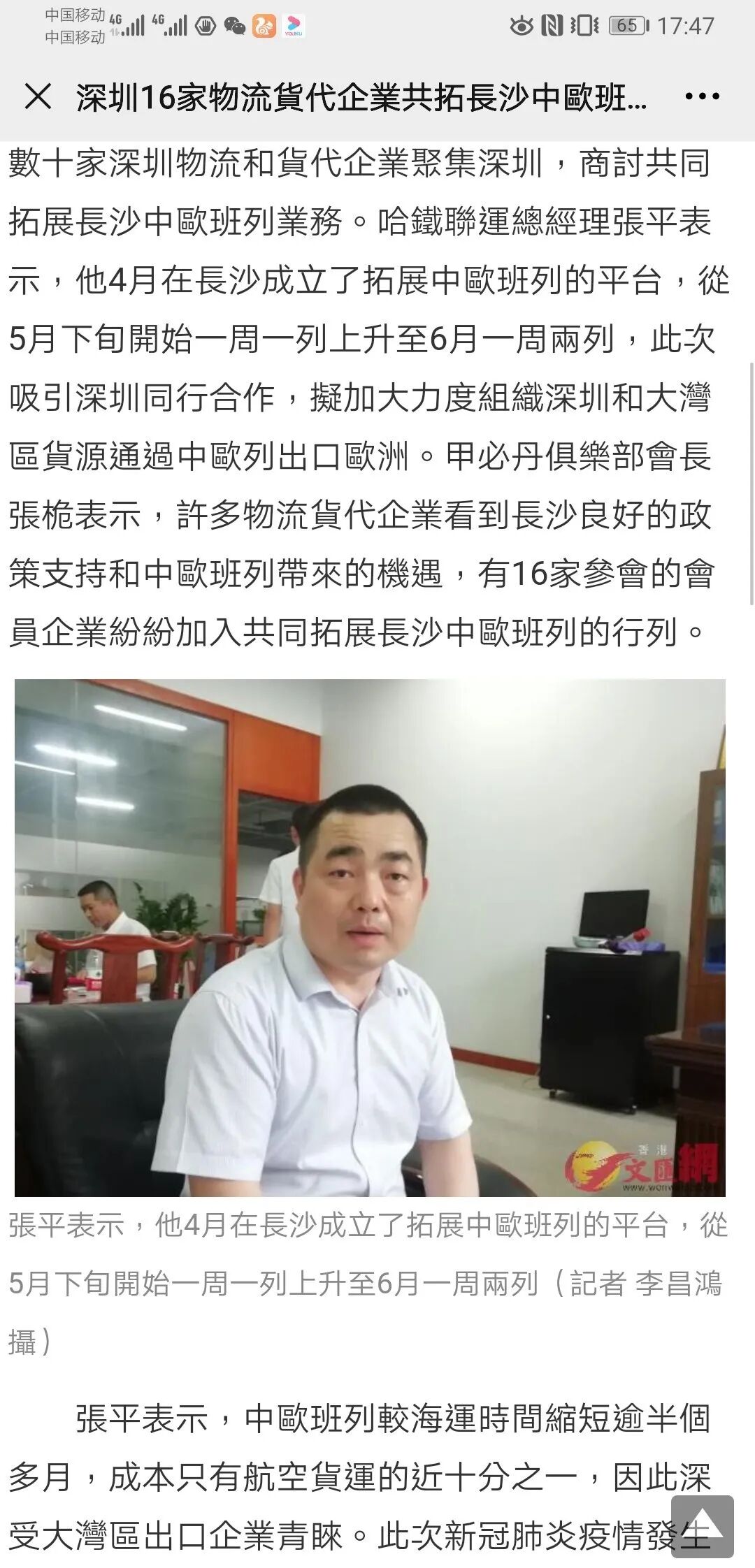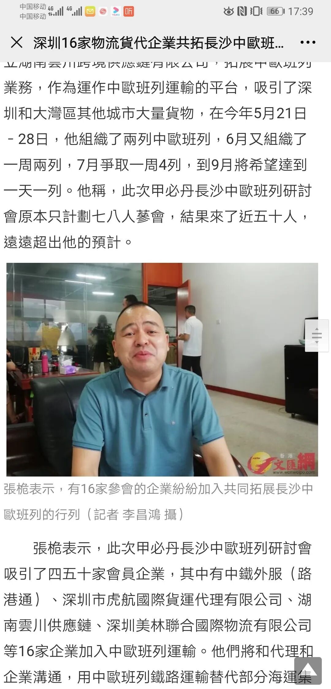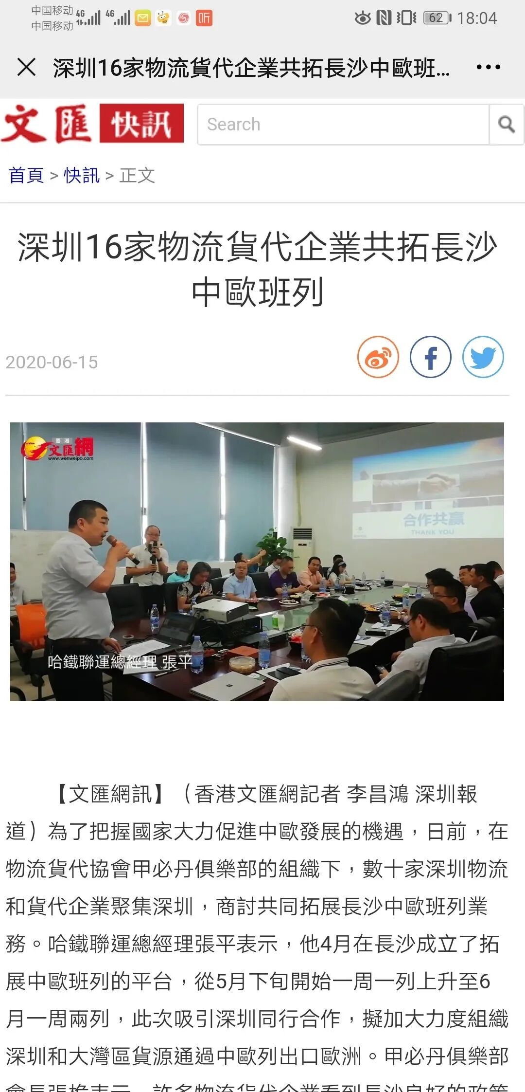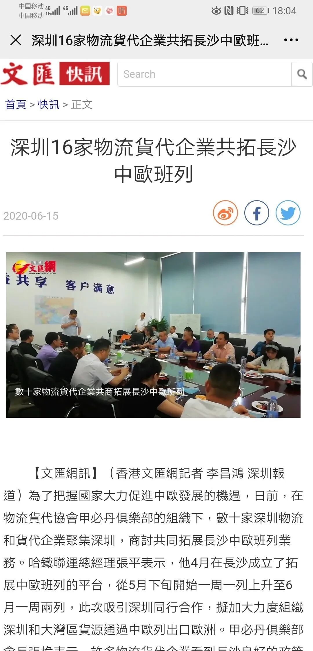 甲必丹总裁会议走进哈铁登录6.15香港大公报头条,深圳16家物流貨代企業共拓長沙中歐班列。