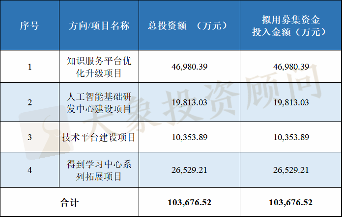 同时,本次思维造物拟募集资金10.37亿元,扣除发行费用后,将用于知识服务平台优化升级、人工智能基础研发中心建设、技术平台建设以及得到学习中心系列拓展等四大与主营业务相关的项目建设,以提高线上线下知识服务的生产、研发和服务能力,并实现新一代智能化、系统化知识搜索引擎和服务软件的构建,为用户提供线上线下联动的知识服务业务,进而增强核心竞争力。