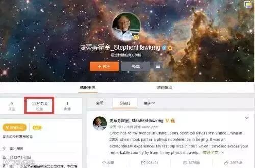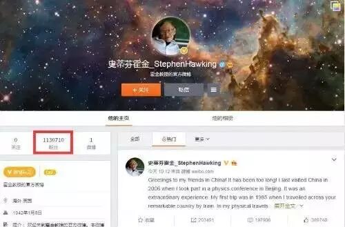 事实上霍金开微博成为话题时,微博CEO王高飞公布了霍金的粉丝构成,其中女性、年轻人和高学历人士居多。