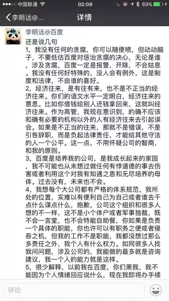 关于此事,李明远在朋友圈发长文做出回复称:自己没有任何贪污,所谓经济往来并非不正当经济往来。此外,李明远在回复中还暗指有人刻意伤害,连带打击百度,落井下石不怕事大。