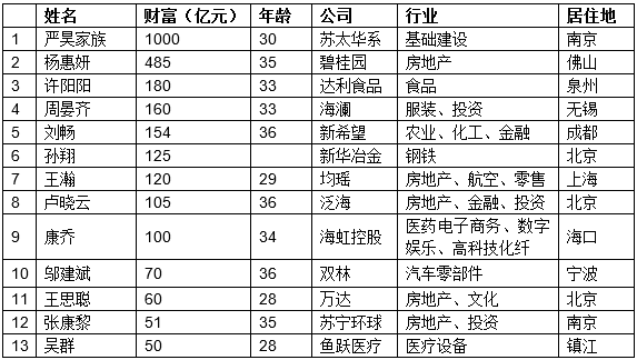 ● 个人财富50亿元及以上的接班人已经找到13位。平均财富205亿。
