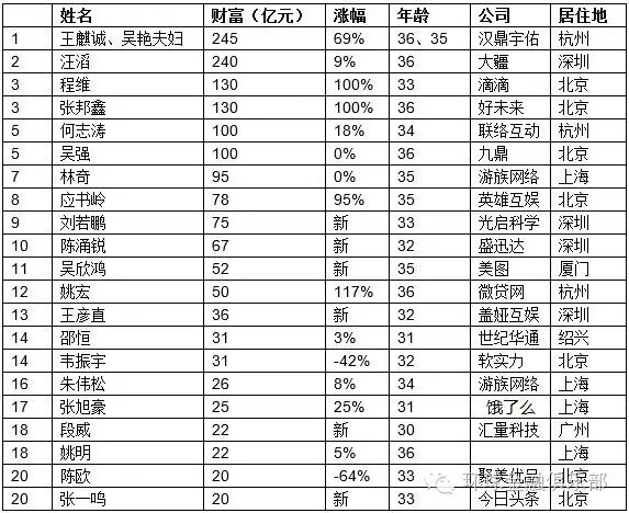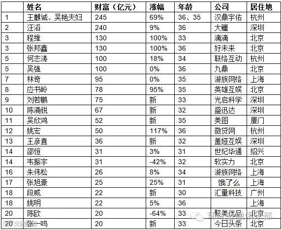 ● 平均年龄34岁,其中,汇量科技30岁的段威成为最年轻的80后白手起家富豪,其次是做汽车零部件的世纪华通31岁的邵恒和大众点评31岁的张旭豪。没有“90后”。