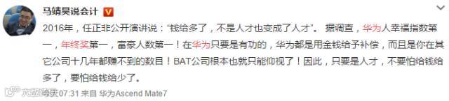 难怪知名财税专家@马靖昊 说:“华为人幸福指数第一,年终奖第一,富豪人数第一!在华为只要是有功的,华为都是用金钱给予补偿,而且是你在其他公司十几年都赚不到的数目!BAT公司根本也就只能仰视了!”