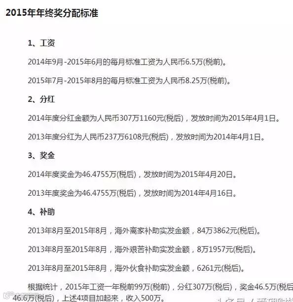 另据传,在2015年,年终奖标准是:毕业生3年待在华为的,有15—20万左右的分红,如果是17-18级员工,03-04年左右进华为的,配股普遍小几十万股,税前分红大约60-70万。如果是2000年前来的,分红能过1百万!!!