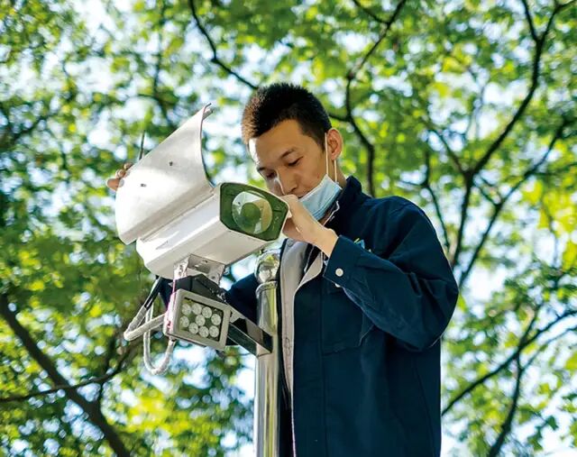 携同科技的工作人员正在维修保养一个包含人脸识别摄像头的智能安防系统