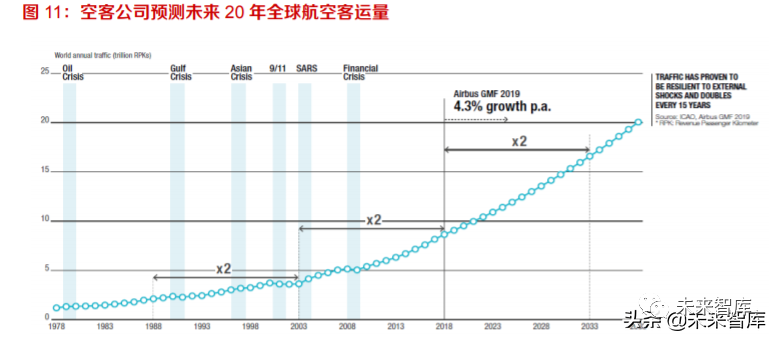 未来十五年全球航空客运量有望翻一番。空客公司 2019 年预测,未来 20 年全球年航空客运量增 长率为 4.3%。在未来 20 年的前十年中,全球航空客运量年增长率将会达到 5.8%的高点,后十年 增长率会逐渐回落至 4.5%左右,但 2029-2038 的总客运量将比前十年增加 25%。根据空客公司 预测,未来 20 年(2019-2038)全球民用飞机(含支线飞机)的总需求量为 39210 架,市场价值 高达 4.9 万亿美元。世界民航机队规模将增长一倍,从 2019 年年初的 22680 架增加至 2038 年的 47680 架,在此期间交付的 39210 架新飞机中,14210 架将用于老旧飞机替换,其余 25000 架为 满足增长需求。