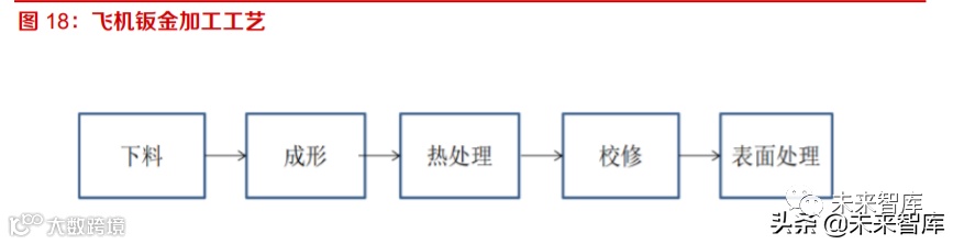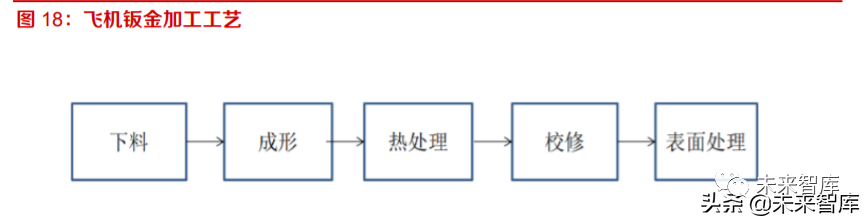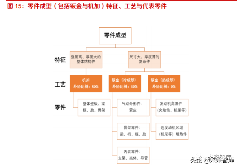 航空零部件加工产业的对象是原材料毛坯件,加工主要环节包括钣金、机械加工、特种工艺与部件 装配。其中,钣金是主要用于板材、型材、管材的一种综合冷加工工艺,而机械加工则主要用于预 拉伸厚板与模锻毛坯,是通过机械设备对工件外形尺寸或性能进行改变的过程,经钣金与机加的航 空零部件分别占 50%。此后,零部件需要进行特种工艺加工,其泛指用各类非传统机械能达到去 除或增加材料的加工方法,目的是实现材料的去除、变形、改变性能或镀覆等。下一步部件装配, 是将经过加工的两个或两个以上的机体零件,组合装配成有限范围的结构单元的工艺过程。历经以 上生产工序后,部件将会移交至主机厂,进行最后的飞机总装。航空零部件加工在传统上由主机厂 进行内部配套,但在未来会逐渐向外部协作企业转移。