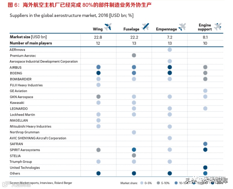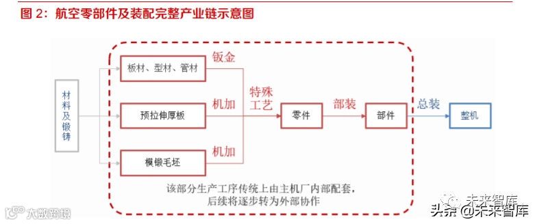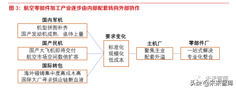 随着产品标准化、规模化要求提升,中上游零部件配套将由内部配套转向外部协作。过去结构件、 零部件的生产主要由主机厂系统内部的工厂负责,甚至包括部分更上游的锻铸件。但随着商业航空 产业规模的持续扩大,现代航空业规模化生产对成本和效率的敏感度提升,过去由各大主机厂自主 承担的零部件配套形式已无法适应专业化和标准化的发展趋势;另一方面,国产大飞机产业化的起 航将带来新的万亿规模市场,在未来配套需求大幅扩张的预期下,很多细分领域将具备产业化的基 础,逐步由以往半研发性质的生产模式转变为现代化的流水生产,并形成系列化的产品型谱。在此 背景下,主机厂从经济性和专业分工的角度考虑,未来将更聚焦于设计、总装和试飞业务,更多的 配套需求逐渐从内部扩散出来,航空零部件业务将采用分包外部协作的形式交由体系外的专业化 企业代工。