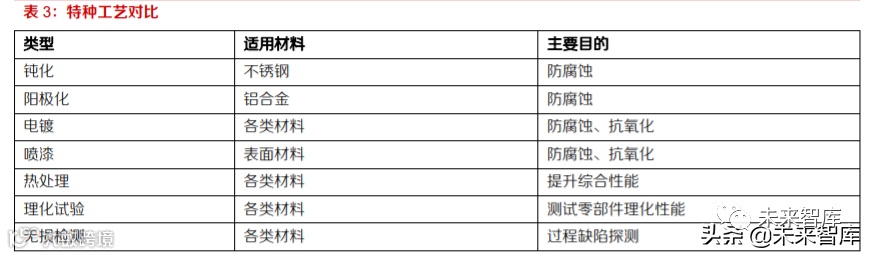 特种工艺受环境保护限制,产业产能扩张受制约。特种工艺产业中有较多环节会产生多方面环境污 染,如电镀工厂会排放含有重金属与有机污染物的电镀废水,以及粉尘、无机污染废气等大气污染 物;热表处理工艺则会排出含工业盐废水与刺激性、窒息性废气。因此,目前相关方面的环保审批 十分严苛,部分城区已不允许再投资建设电镀等部分特种工艺产线。环保政策在较大程度上限制了 特殊工艺(主要是表处理)产能的扩张,提前布局相关产能的公司未来有望获得较好的发展契机。当前国内航空制造领域特殊工艺处理产能绝大多数集中在国有主机厂等国有大型企业,未来或逐 渐外协。