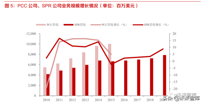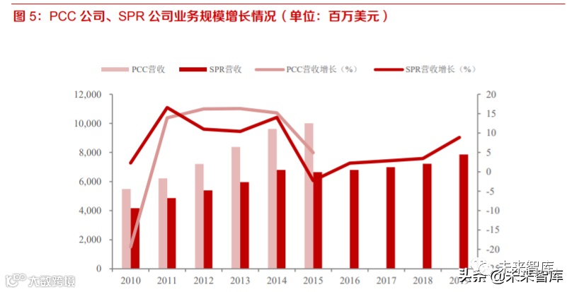 外协规模的增长催生了若干家千亿市值的专业化航空零部件加工企业。从美国航空业发展情况来 看,不少外部协作公司已拥有了庞大的规模与市值,如航空锻铸领域巨头 PCC(精密铸件公司) 在 2006—2015 年取得了 13%的营收复合增长率,并于 2016 年被巴菲特以 372 亿美元的价格私 有化;零部件加工领域的 SPR,前身为 2005 年从波音公司独立出来的威奇托工厂,在 2010—2019 年取得了 10%以上的营收复合增长率(2019 年营收高达 78.6 亿美元)。