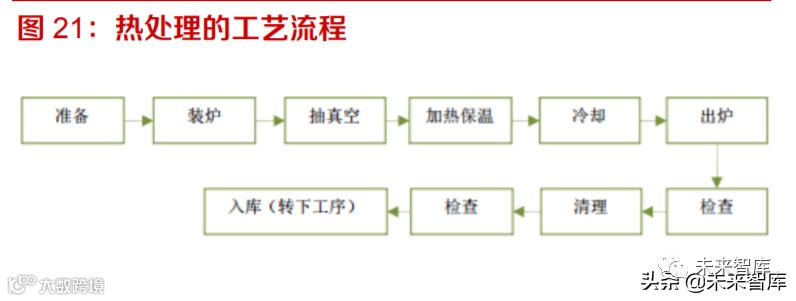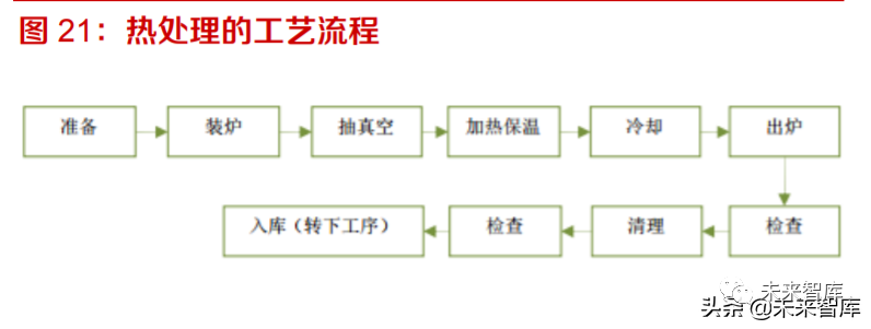 热处理工艺一般包括加热、保温、冷却等工序。由于航空零部件加工材料主要为金属材料, 材料自身会存在一定的内应力,通过机械加工后材料内应力加大,当内应力突破界限时,零 部件会产生裂纹,导致产品质量问题。为了避免质量问题,一般会对零部件半成品或成品进 行热处理,以改变力学性能、物理性能和化学性能,达到消除内应力的目的。热表处理可以 大幅提高航空零部件耐蚀性、硬度、耐磨性、绝缘性、耐热性等性能。