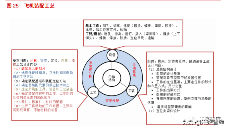 航空工艺装备产业主要为零件成型和部件装配服务。工艺装备是制造产品所需的刀具、夹具、模具、 量具和工位器具的总称,可分为通用工装与专用工装两类。航空工装属于专用工装,可用于飞机零 部件成型或部段、整机装配,其设计的基本要求为以下三点:1)设计基准应力求与航空产品基准 一致;2)结构需有足够的刚度、强度;3)具有较强的尺寸稳定性。航空工装设计在飞机生产过程 中占据重要地位,工装设计水平直接影响飞机产品的生产周期和产品质量。