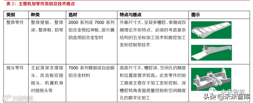 机械加工是指通过数控机床设备对毛坯件的进行切削加工的过程。机加主要面向难加工的整体结 构件,相比铆接结构,整体结构具有气动外形准确、刚性好、比强度高,可减少零件和连接件数量, 使部件成本降低 50%左右。目前整体结构件已成为构成飞机机体骨架和气动外形的重要组成部分。为了减轻重量,进行等强度设计,往往整体件上会形成各种复杂型腔。与一般零件相比,整体件加 工难度大,制造水平要求高。例如壁板、梁、框等整体结构件是由构成飞机气动外形的流线形曲面、 各种异形切面、结合槽口及交点孔组合而成的复杂组合体。机加零件大部分是预拉伸厚板、模锻毛 坯或者切削性能较差的钛合金,精密且复杂的外形带来了繁琐的机械加工过程,往往动辄数百个工 序,通过优化加工过程、简化工序,可以较好地降低生产成本,显著提升效益。