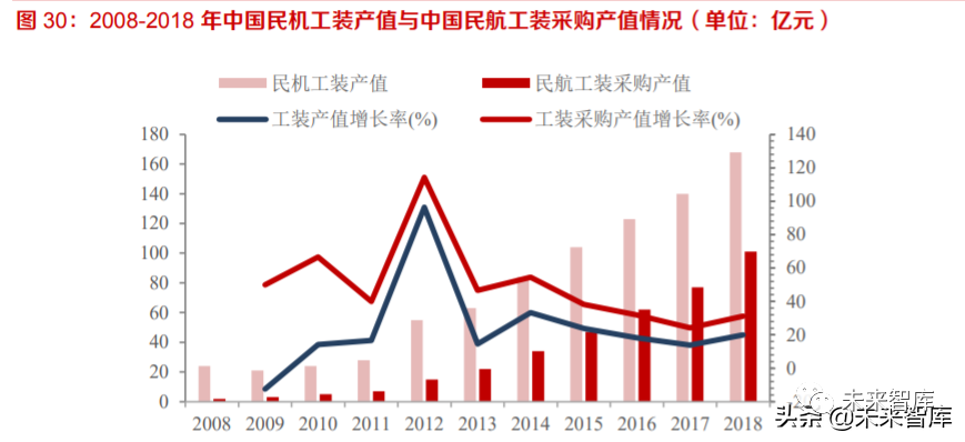 航空工装产业与航空零部件产业同步高速增长。工装产业是为机加、钣金、装配提供支持,因此基 本与受支持产业保持同步增长。由于我国航空及零部件产业此前增长较快,因此航空工装产业也经 历了高速增长,我国民用飞机工装产值从 2008 年的 24 亿元增长到 2018 年的 168 亿元,复合增 长率 24.14%;我国民航工装采购产值也从 2008 年的 2 亿元增长到 2018 年的 101 亿元,复合增 长率 54.62%。预计 2021 年我国民用航空工装产值将达到 290 亿元,民用航空工装采购产值达到 204 亿元。然而,该产业发展也存在一定的潜在风险,如果单一机型放量、改型需求减少,工装需 求增速可能下降。