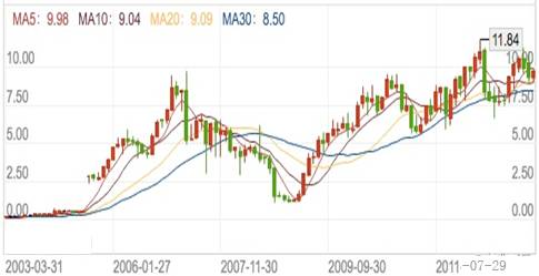 ▲达芙妮2003-2011年股价走势,这时的达芙妮一路高歌