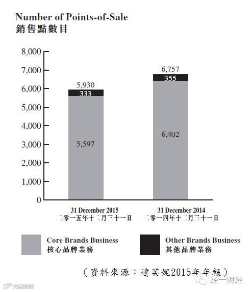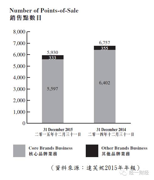 其销售网络包括核心品牌(于中国大陆的「达芙妮」和「鞋柜」)约六千多个销售点及其他品牌约数百个销售点。