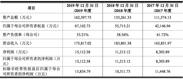 财报显示,2017年-2019年,南亚新材实现营收分别为16.39亿元、18.38亿元、17.58亿元;净利润分别为8303.89万元、1.12亿元、1.51亿元。