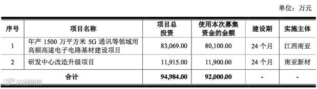 此次,南亚新材拟募资9.2亿元用于投建“年产1500万平方米5G通讯等领域用高频高速电子电路基材建设项目”、“研发中心改造升级项目”等。