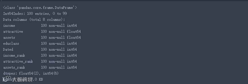从上述信息可以看出数据集总共有100个观测,8个变量。其中浮点型2个,整型6个。还可以看出这个数据集占用了我电脑7k的内存。