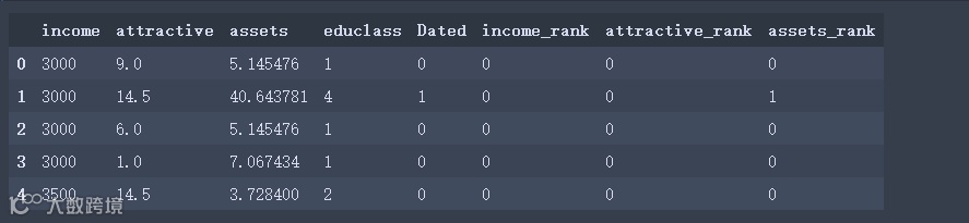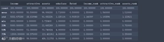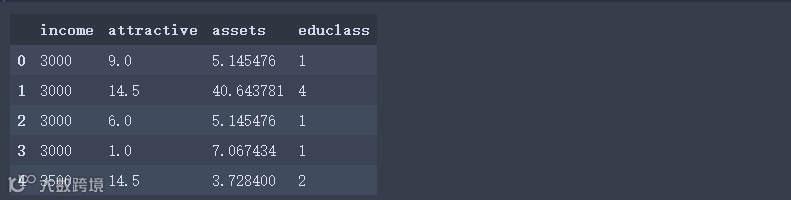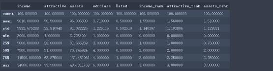 我从数据库中挑选了收入、魅力值、资产、教育等级变量,并对收入、魅力值和资产进行了分类排序。