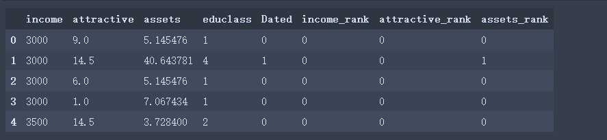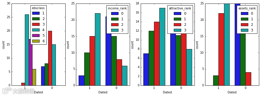 可以看出,教育等级,收入,魅力值,资产都和是否约会成功有密切关系。