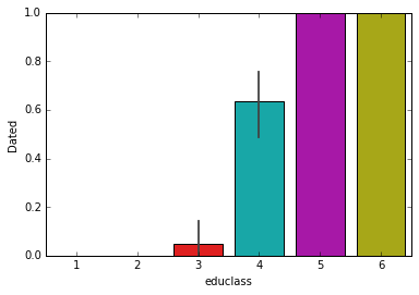 sns.barplot(x='educlass',y='Dated',data=orgData);