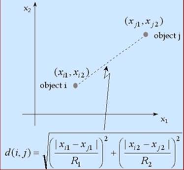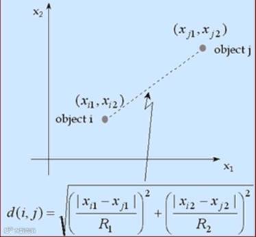 数据的属性有Scale的问题,比如收入和年龄的量纲单位不同,则不能简单的加总来计算距离,需要进行极值的正规化,将输入变量维度的数据都转换到【0,1】之间,这样才能进行距离的计算。计算公式如下: