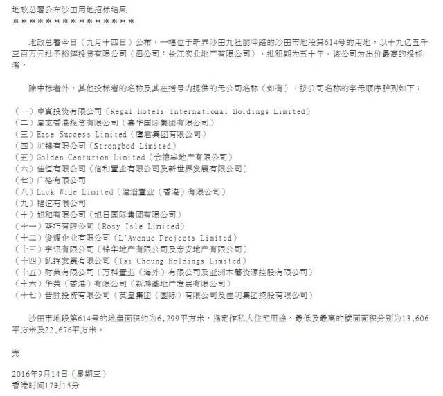 根据香港地政署的公告,一共有17家公司参与了土地招标,可谓竞争空前激烈。这块土地的名称是:新界沙田九肚丽坪路的沙田市地段第614号用地。土地使用期为50年,面积大约6299平方米,最高可以建设22676平方米的住宅。