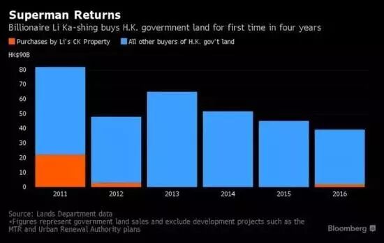 ▲2011~2016年,李嘉诚在香港买地情况(桔色:长江实业;蓝色:其他地产商。数据来源:香港地政总署;图片来源:彭博)