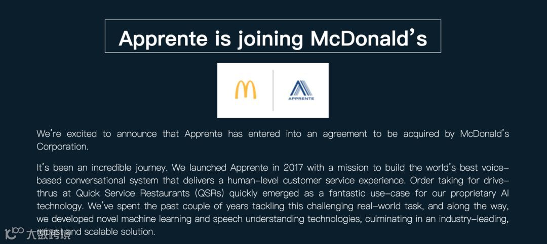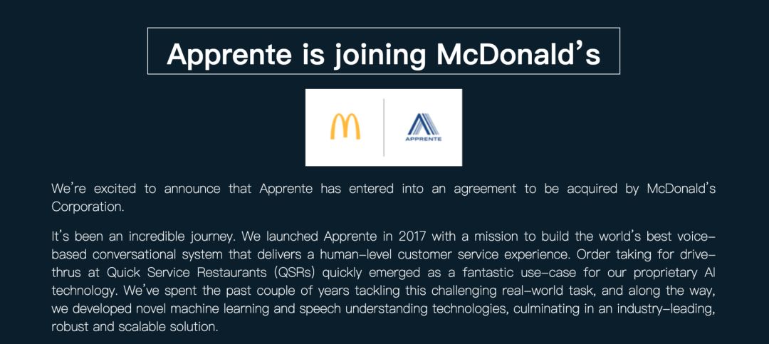 Apprente的语音技术非常契合的击中了“点餐”这一需求。过去两年,Apprente一直致力于开发理解“复杂、多语言、多重口音和多项目对话排序”的技术。这一收购预计将加快麦当劳“drive through”客户的购买体验,获取更快、更简单、更准确的订单,并且大大减少人力成本。