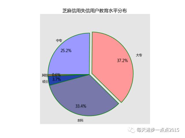 关于pie函数的参数我们讲了这么多,光讲不练假把式,我们接下来通过案例,来绘制一个个性化的饼图。关于绘图数据,我们借用芝麻信用近300万失信人群的样本统计数据,该数据显示,从受教育水平上来看,中专占比25.15%,大专占比37.24%,本科占比33.36%,硕士占比3.68%,剩余的其他学历占比0.57%。对于这样一组数据,我们该如何使用饼图来呈现呢?
