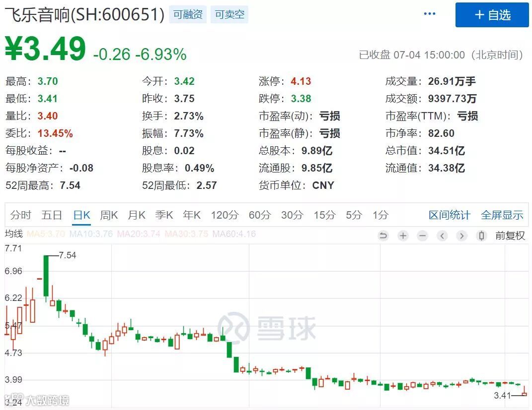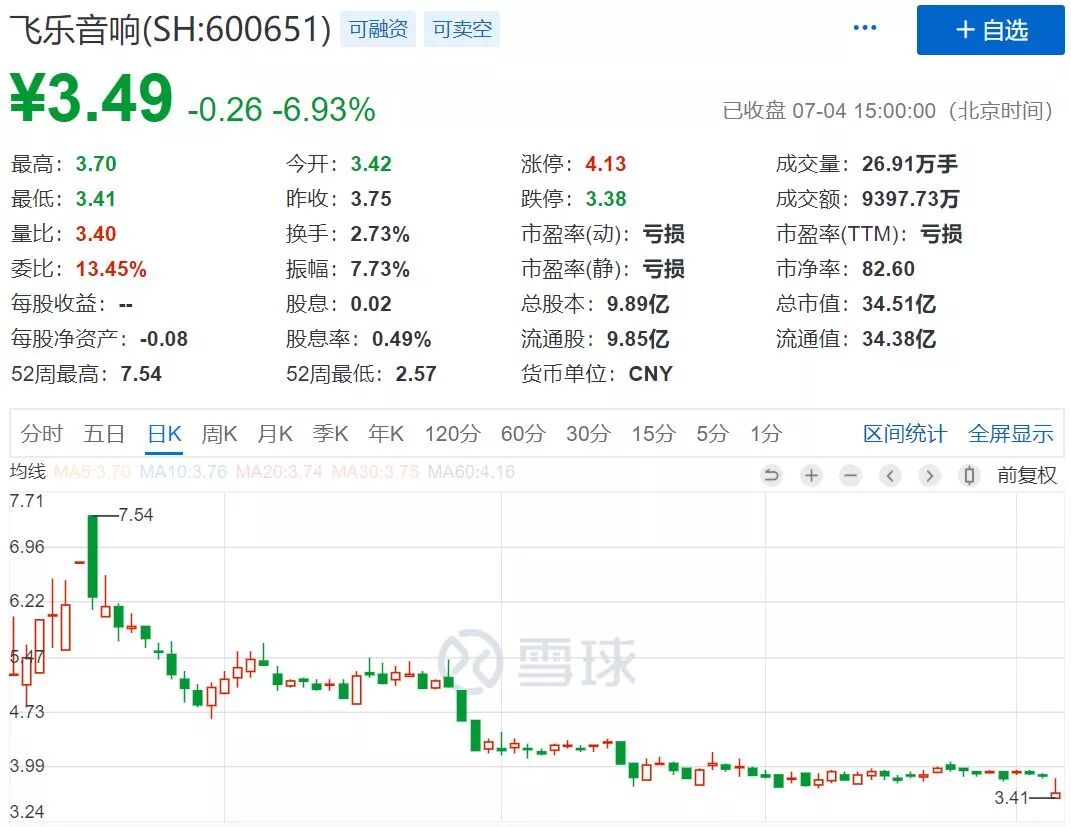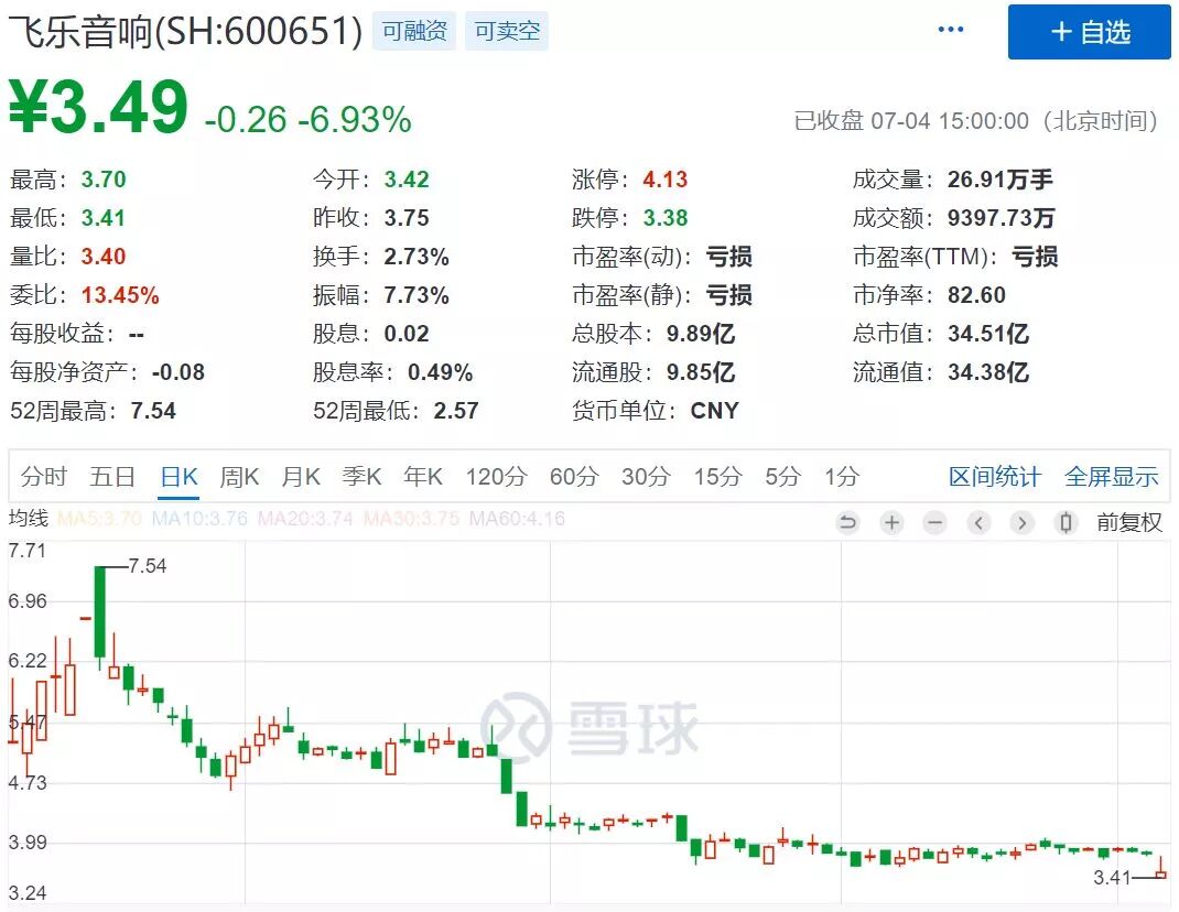 受此影响,股价已遭腰斩的飞乐音响,今日开盘大幅低开逾8.8%,创下本来暴跌的最低点3.41元,截止收盘,股价跌幅仍近7%,总市值仅剩34.51亿元。