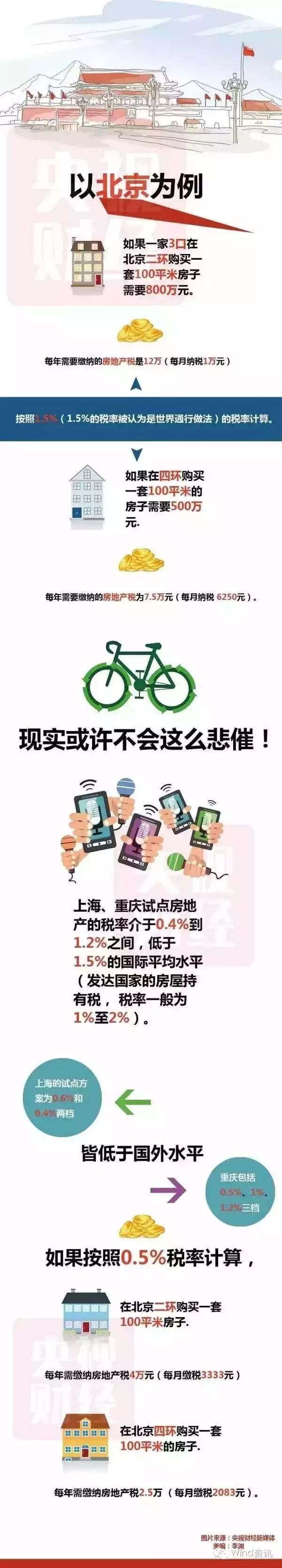 目前国际房地产税利一般在1%-2%之间,世界通行税利水平在1.5%。如果一家3口在北京二环购买一套100平米房子需要800万元,每年需要缴纳的房地产税是12万(每月纳税1万元);如果在四环购买一套100平米的房子需要500万元,每年需要缴纳的房地产税为7.5万元(每月纳税 6250元)。
