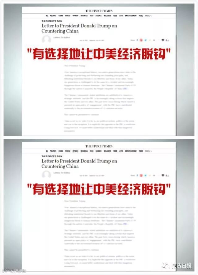 两周后,又有一封包括美国退役军人、前情报官员、学者、智库成员等在内的联名公开信发表,鼓动有选择地让中美经济脱钩。