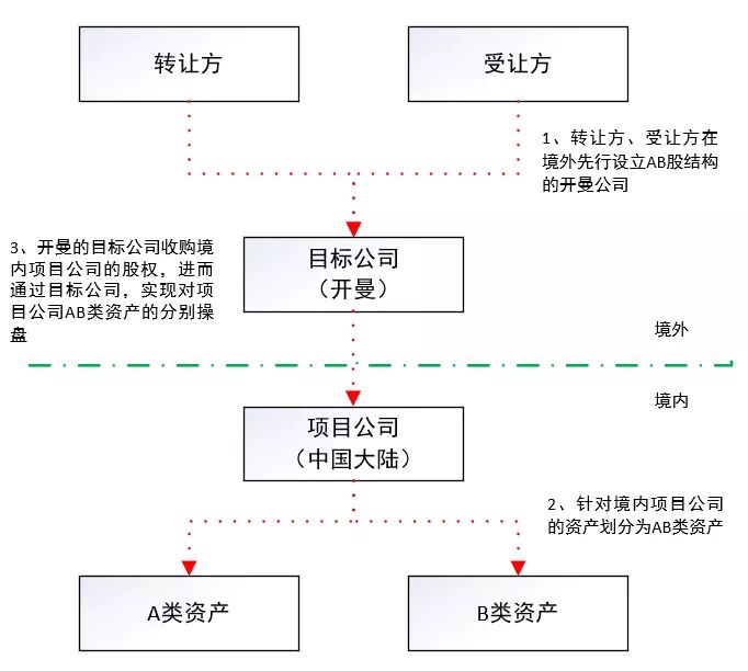 该等交易结构应用的情形较少,一般来说,标的资产位于中国境内(大陆),且因种种因素导致资产转让/剥离存在障碍,因此交易双方选择在境外(开曼)搭建交易结构并完成交易,并约定转让完成后,持有A股的转让方持有A类资产,持有B股的受让方持有B类资产(该等交易模式依赖于开曼的法律规定,因此在法律适用方面需特别考虑)。