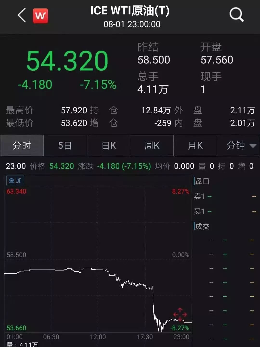 纽约商品交易所9月交割的西德州中质原油(WTI)期货价格重挫4.63美元,跌幅达7.9%,收于53.95美元/桶,创6周以来的最低收盘价。这是主力WTI期货4年来的最大单日跌幅。
