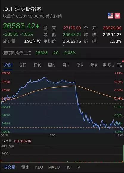道指跌近300点,跌幅为1.05%,报26583.42;