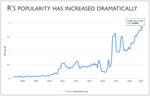 这并不是说R语言是唯一的语言,也不是说它是每个工作的最佳工具。然而,它是使用最广泛的,而且越来越受欢迎。
