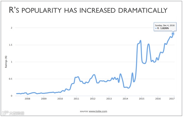 此外还有TIOBE指数(按搜索引擎搜索次数对编程语言进行排名)。在TIOBE指数上,R语言十年来呈现出稳定上升趋势。
