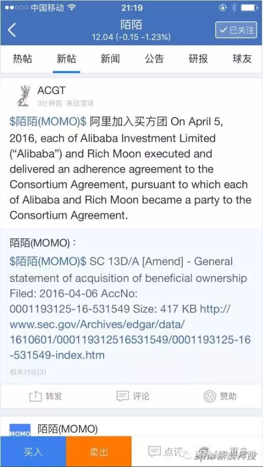 据最新sec文件显示,阿里巴巴和云峰基金控制的Rich Moon提交了加入陌陌私有化买家团的公告,此前陌陌私有化买家团成员有唐岩、经纬中国、红杉和华泰基金。