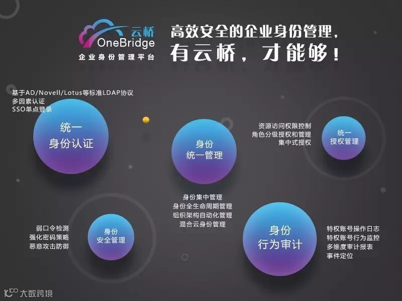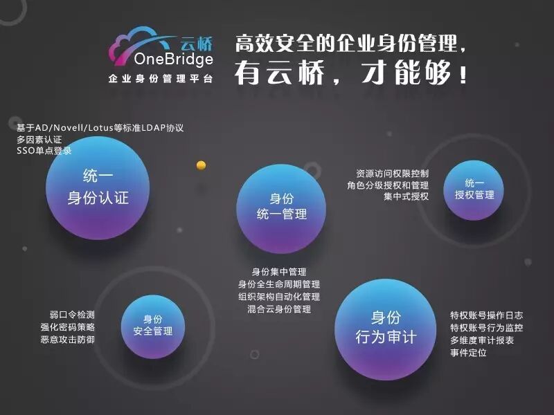 云桥OneBridge企业身份管理平台是荣之联公司为企业提供的云时代的身份管理解决方案。云桥旨在为企业打造全方位、规范化的用户身份管理平台,实现自动化的用户身份全生命周期管理。同时,云桥还可以助力混合云用户实现高效安全的混合云身份管理。通过企业身份管理平台的统一门户,可以对各业务系统的身份信息进行集中管理、统一认证、授权,审计和安全管理。