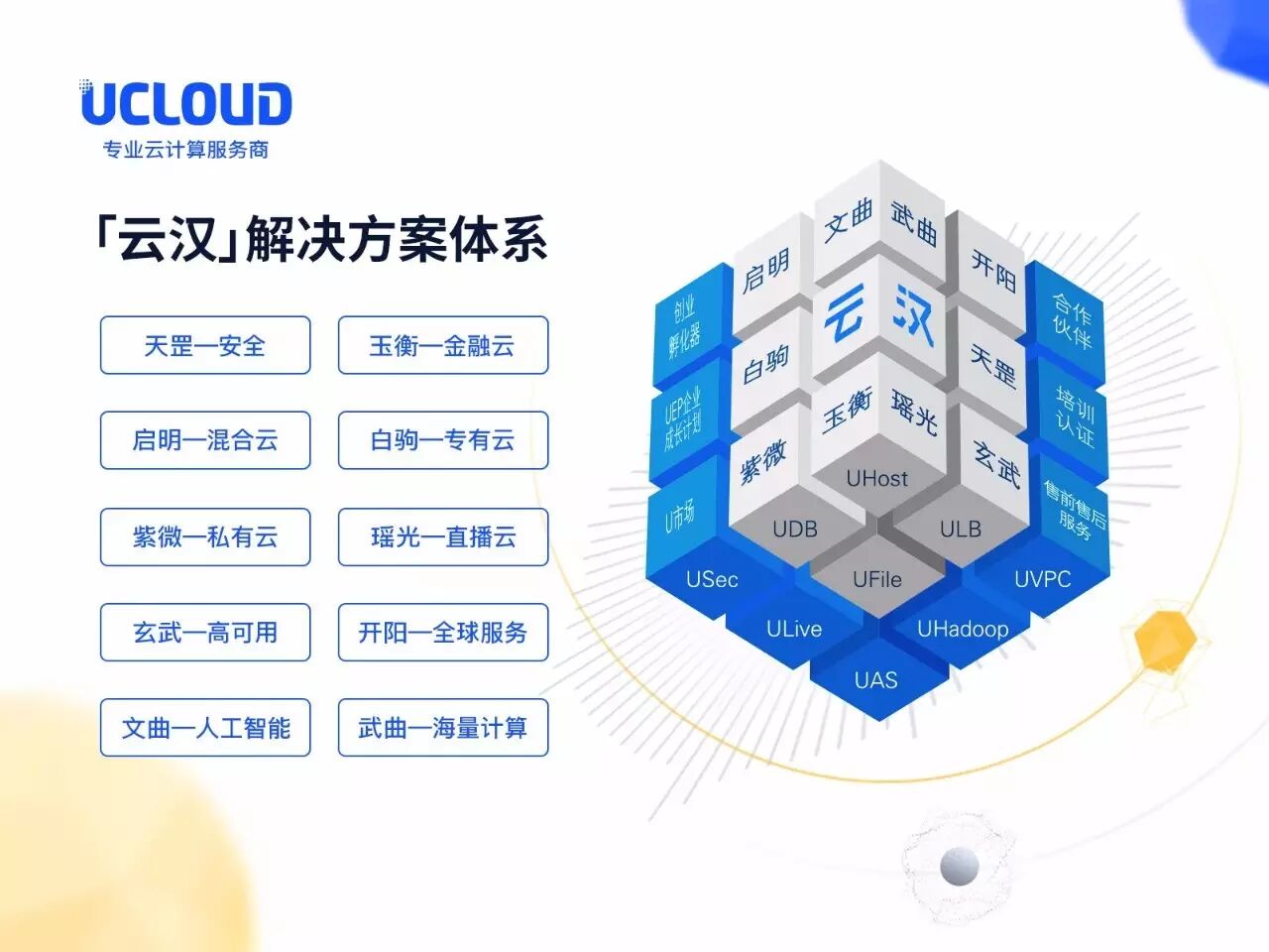 UCloud是国内领先的云计算服务平台,自主研发并提供计算资源、存储资源、网络资源等企业必需的基础IT架构服务,并在深入了解互联网、移动互联网、传统企业不同场景的业务需求下,深挖行业痛点,推出“云汉”产品解决方案体系,内含十大解决方案,为不同的客户需求提供“定制化“产品和服务。UCloud已为近5万余家企业级客户提供服务,间接服务用户数量超过10亿,部署在UCloud平台上的客户业务总产值逾千亿人民币。