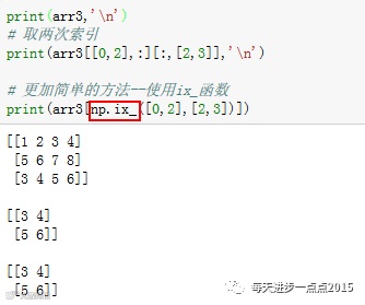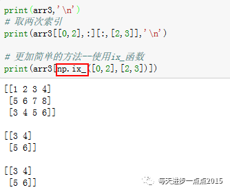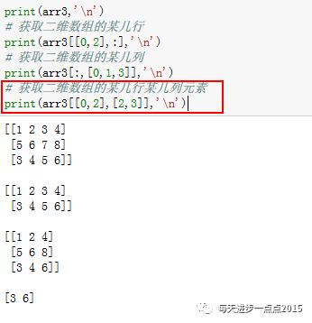 咦?报告,你最后一个返回的结果错了,你不是要返回由第一行、第三行、第三列和第四列组成的2×2矩阵吗?为什么是一个1×2的一维数组?如果像上面红框中使用索引的话,将获取【0,2】和【2,3】对应的两个值。那该如何返回想要的2×2的矩阵呢?我们可以这样写: