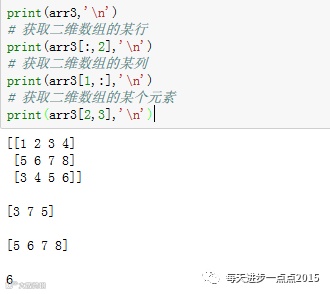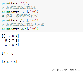 使用索引的方式,查询一维数组和二维数组的元素。一维数组的索引与列表、元组的索引完全一致,这里就不在赘述;二维数组的索引就稍微有点复杂,我们可以通过例子来说明: