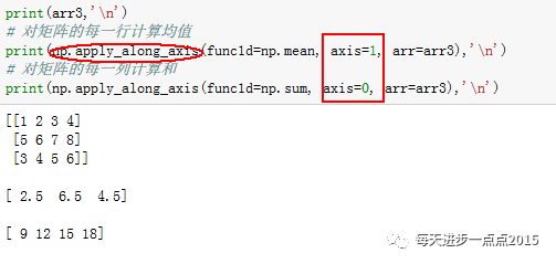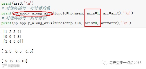 apply_along_axis函数与R语言中的apply函数用法一致,可以针对某个轴的方向进行函数操作,同样,而且在pandas模块中的DataFrmae对象中,可以使用apply函数达到相同的效果。我们举一个例子来说明一下apply_along_axis函数的应用: