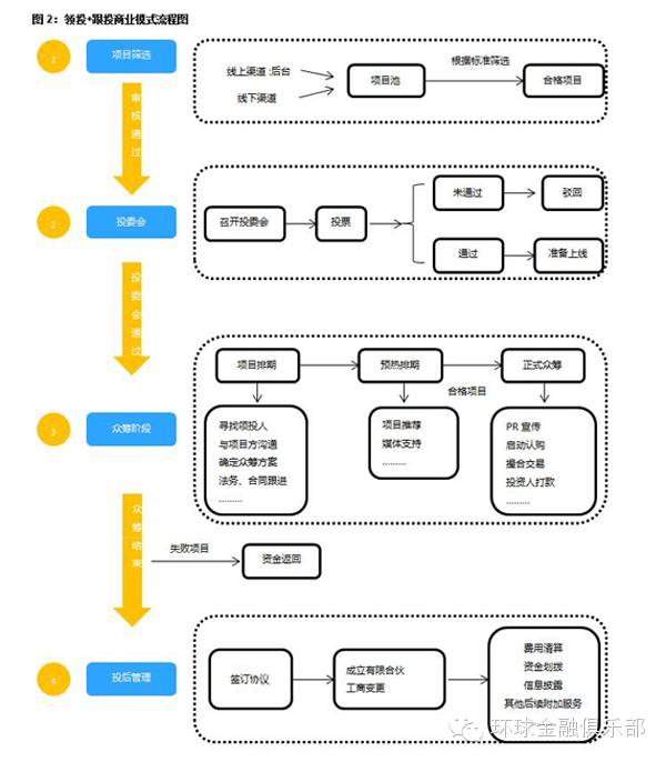 国内股权众筹目前多采用“领投+跟投”的商业模式,也可以成为Syndicates模式,我们针对各家平台众筹商业模式进行整理,以下为总结归纳的操作流程图。
